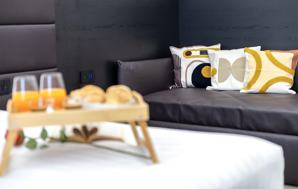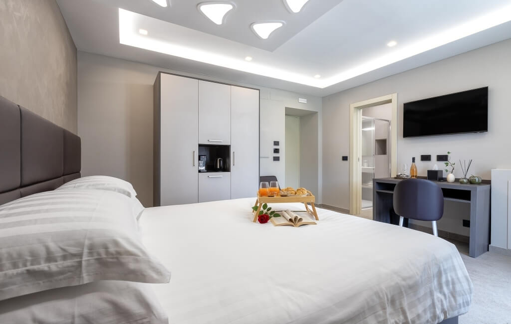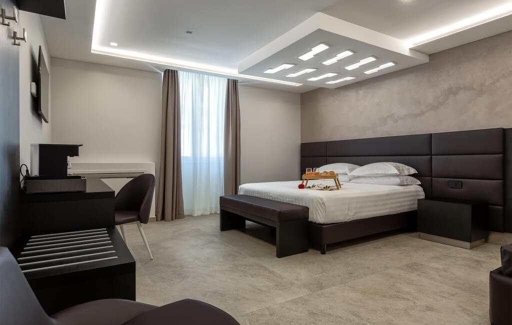 Tutte le camere sono arredate in eleganti tonalità tortora e testa di moro, con particolare attenzione all’insonorizzazione e alla generosità degli spazi, per un soggiorno confortevole e riservato nel cuore di Alghero.