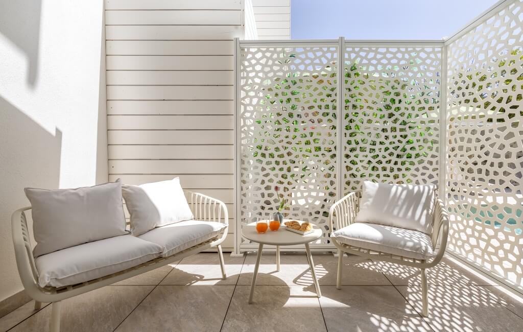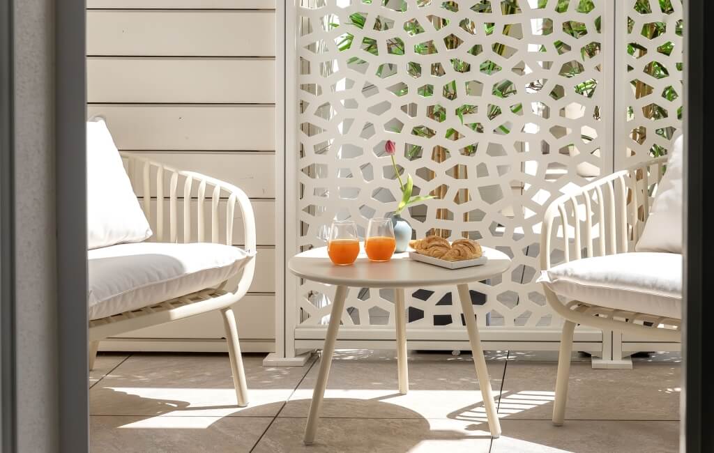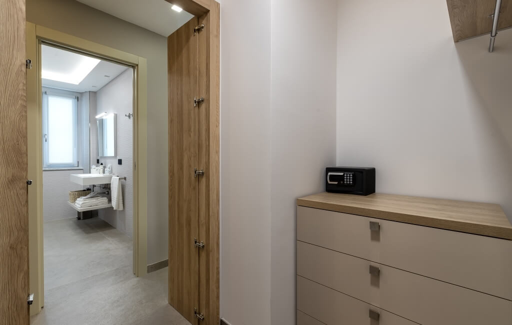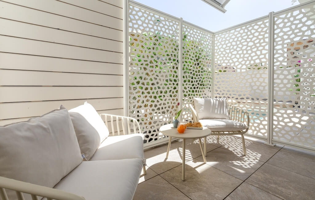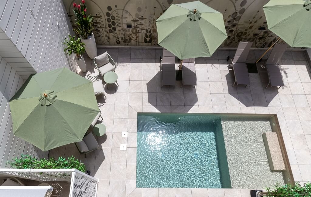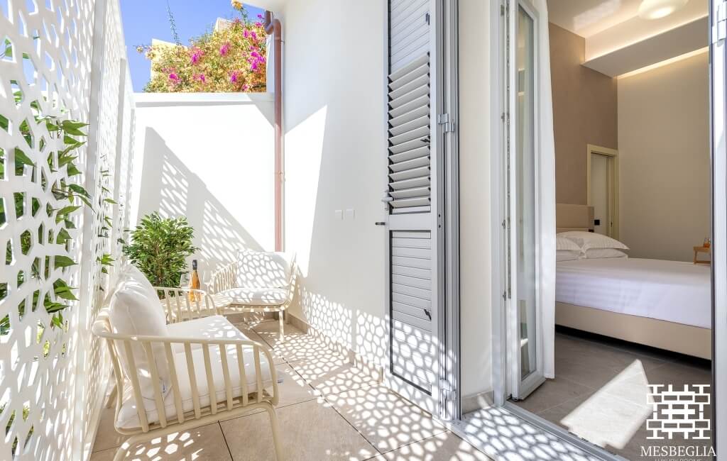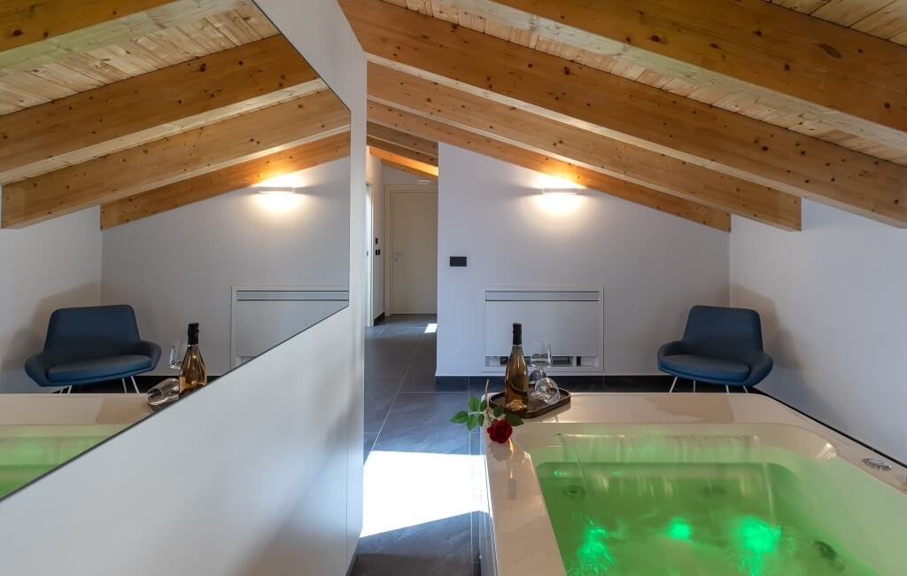 Al piano terra troviamo due sistemazioni che dispongono di un patio riservato che si affaccia sulla piccola piscina, ideale per rilassarsi all’aperto. Al primo piano, comodamente raggiungibili con un ascensore, alcune camere dispongono di un balconcino arredato con sedie e tavolino, mentre al secondo piano troviamo le due Junior Suite mansardate con vasca idromassaggio.