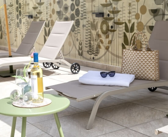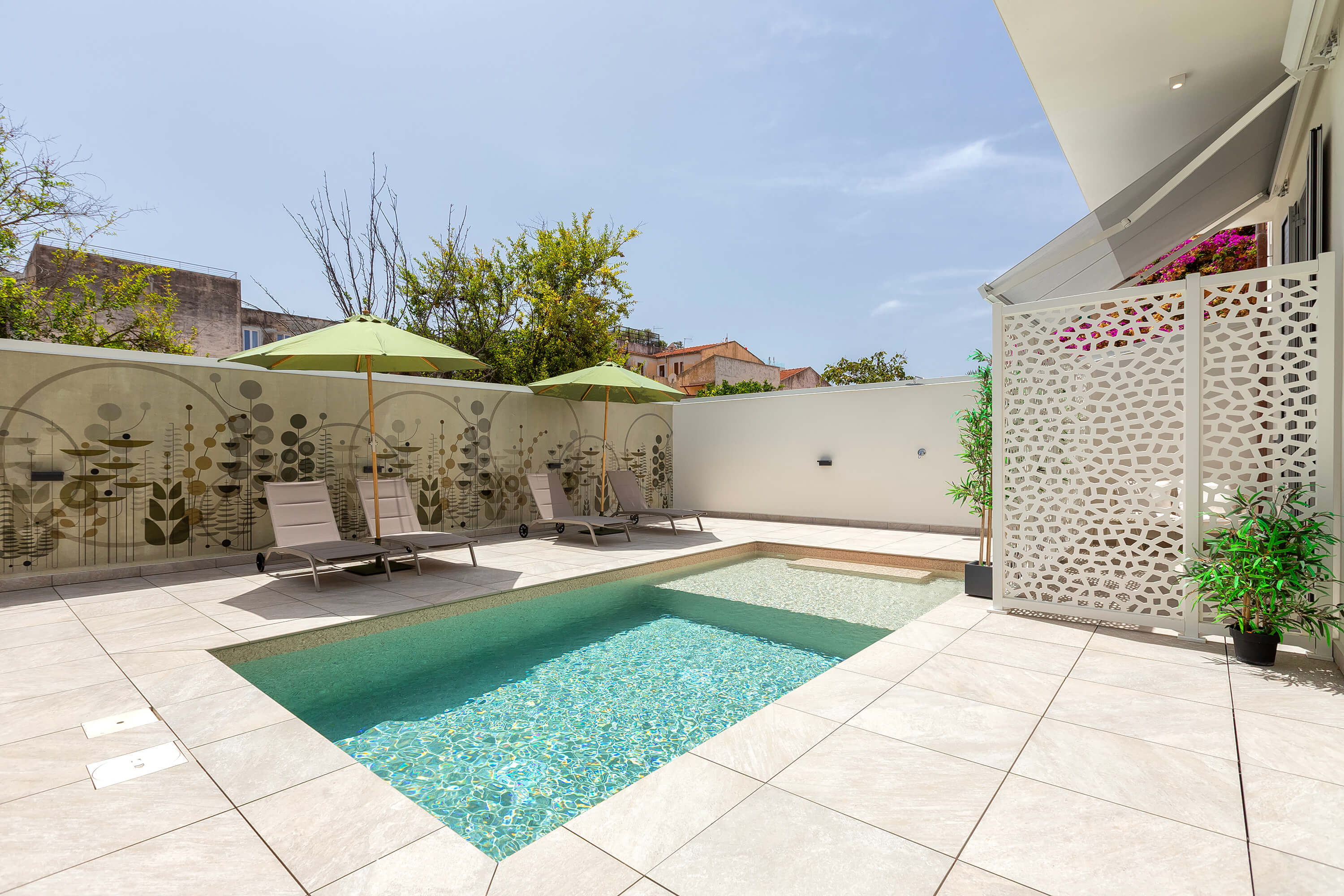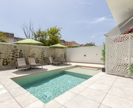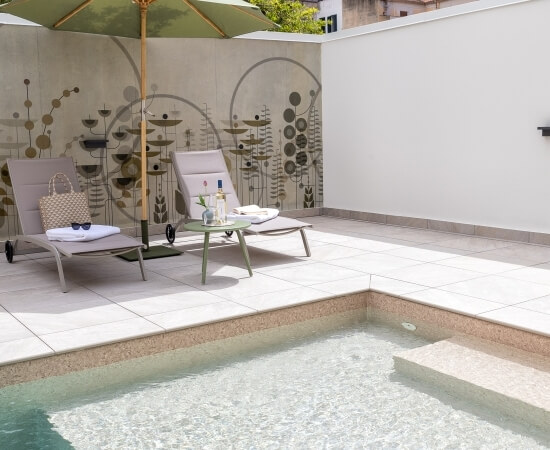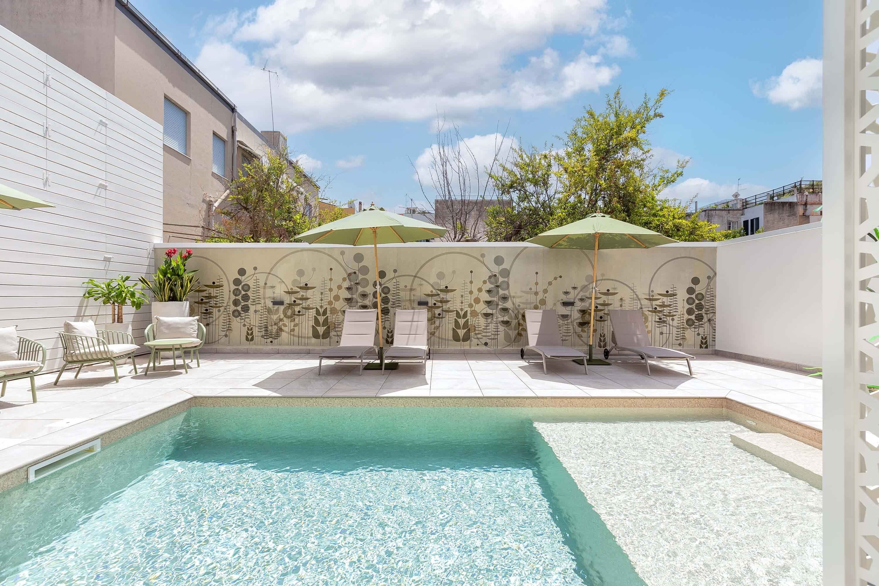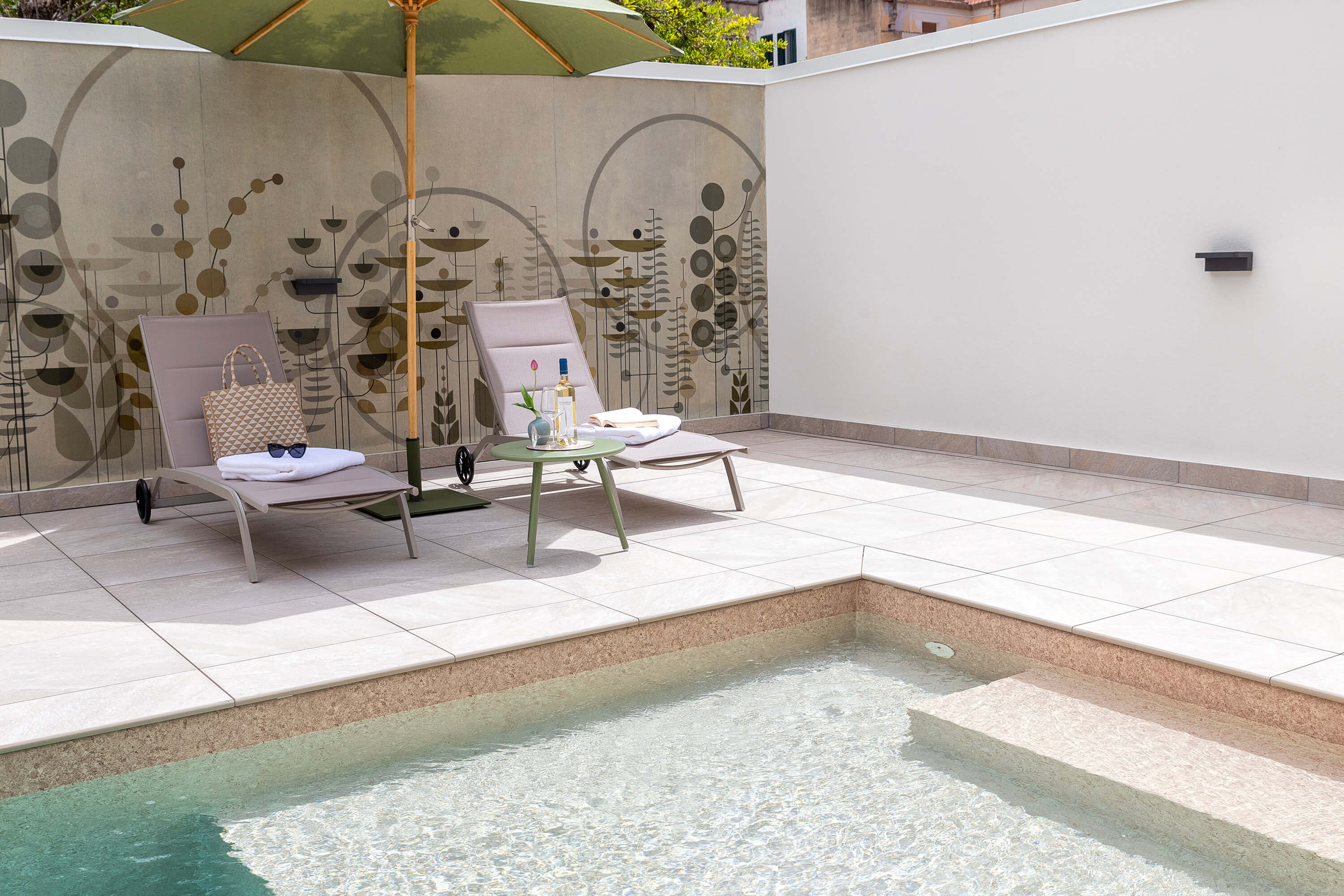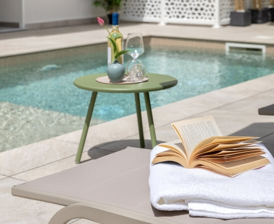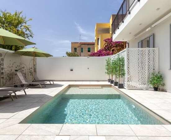 Attrezzata con eleganti chaise-longue e ombrelloni, la piscina offre uno spazio intimo e curato nei dettagli, perfetto sia per un tuffo rinfrescante che per rilassarsi al sole con un buon libro o un bicchiere di vino.