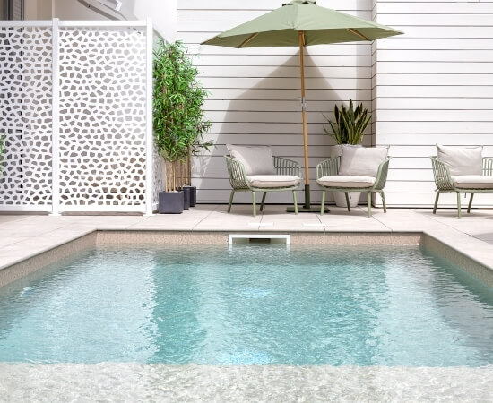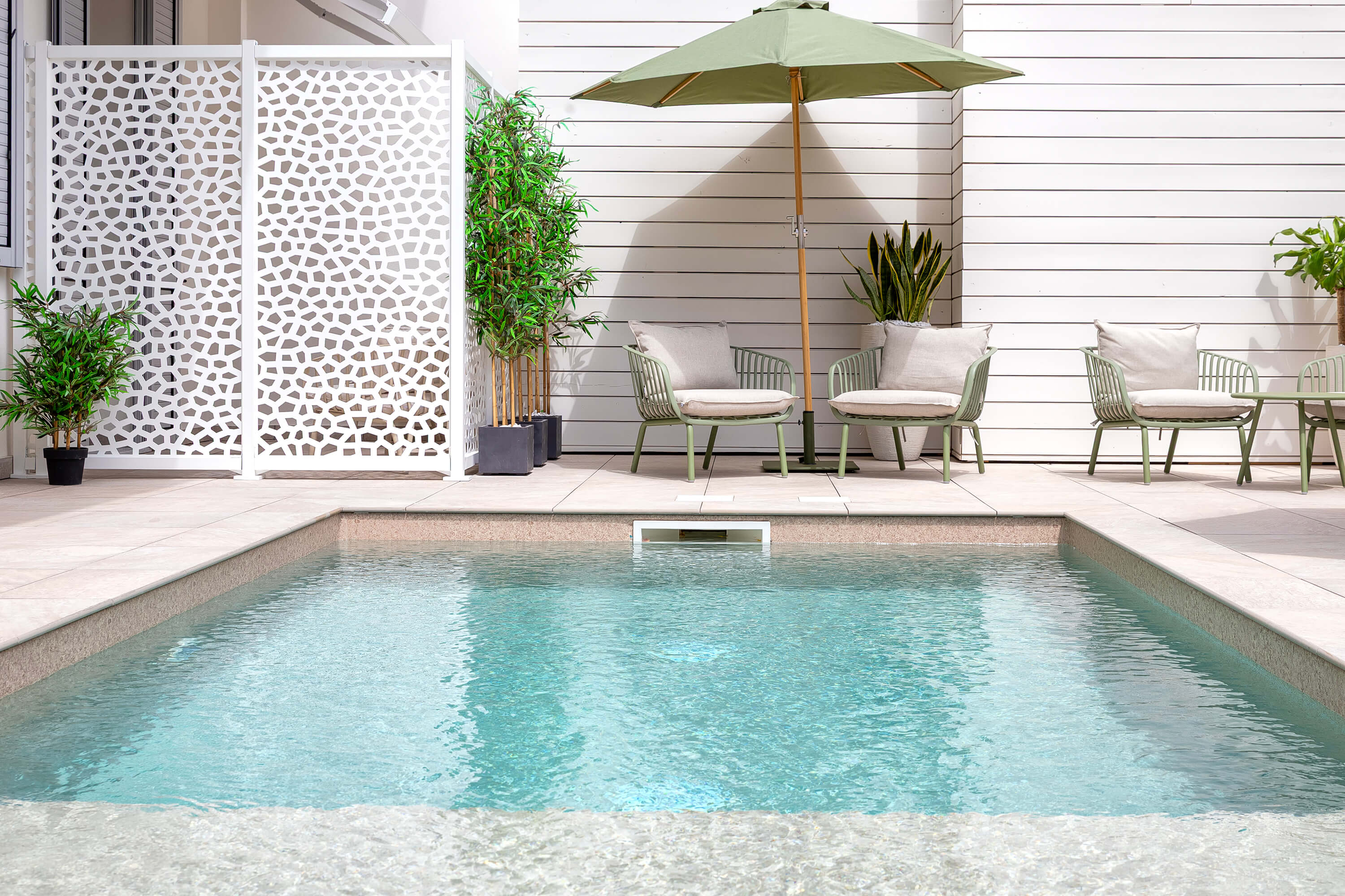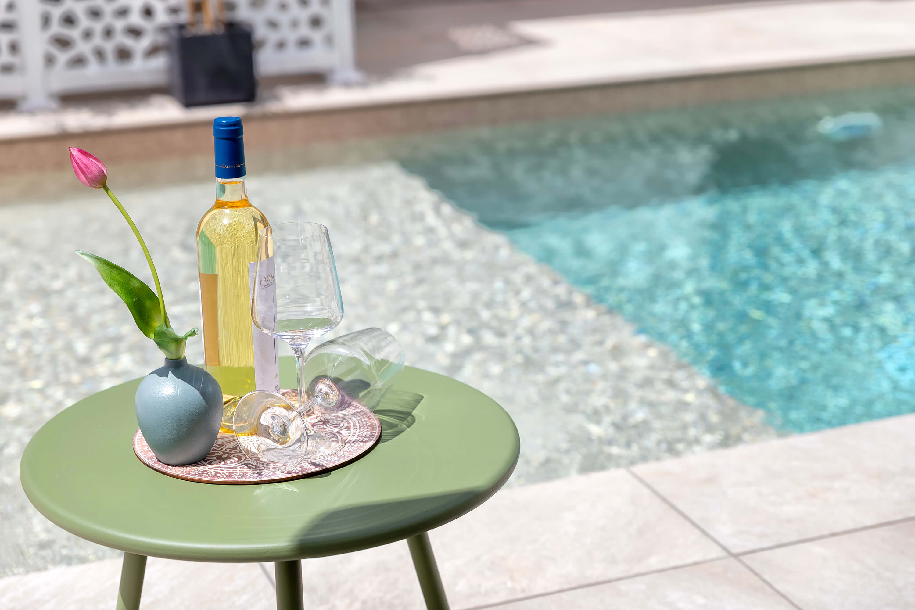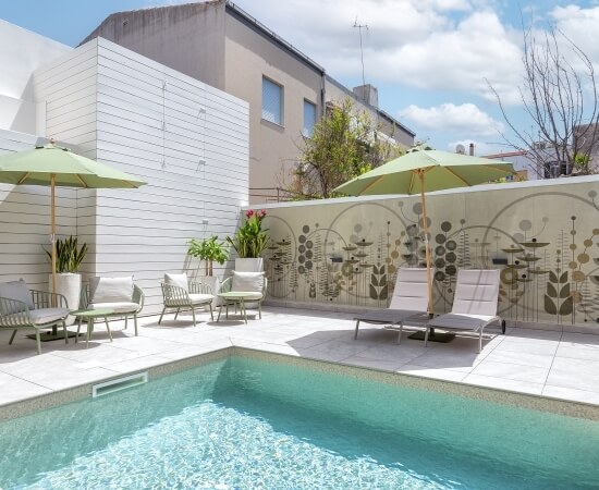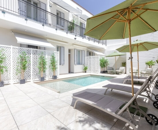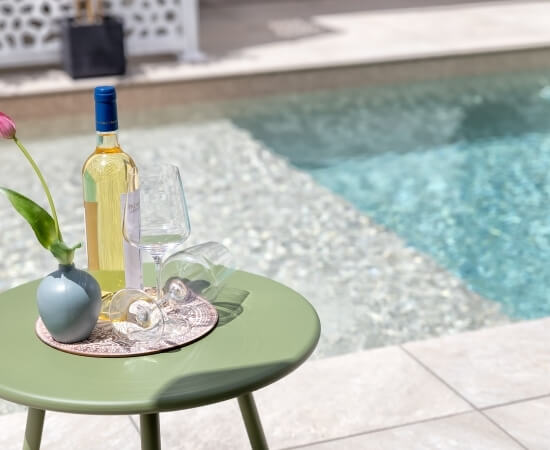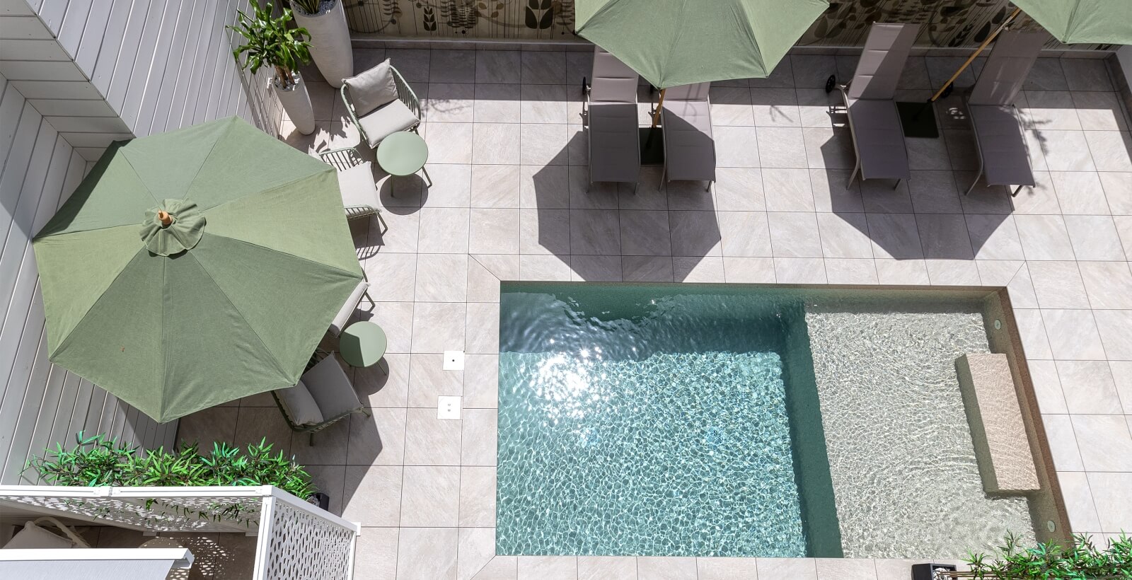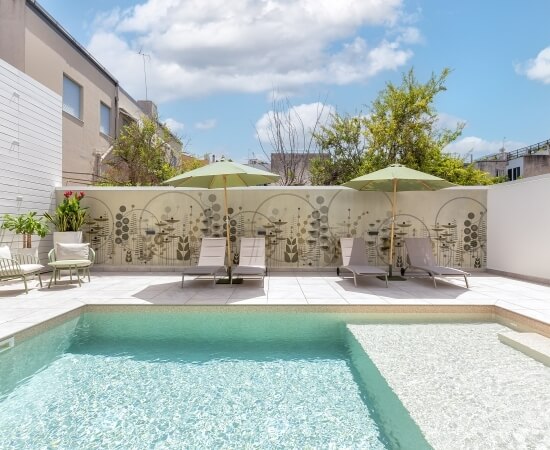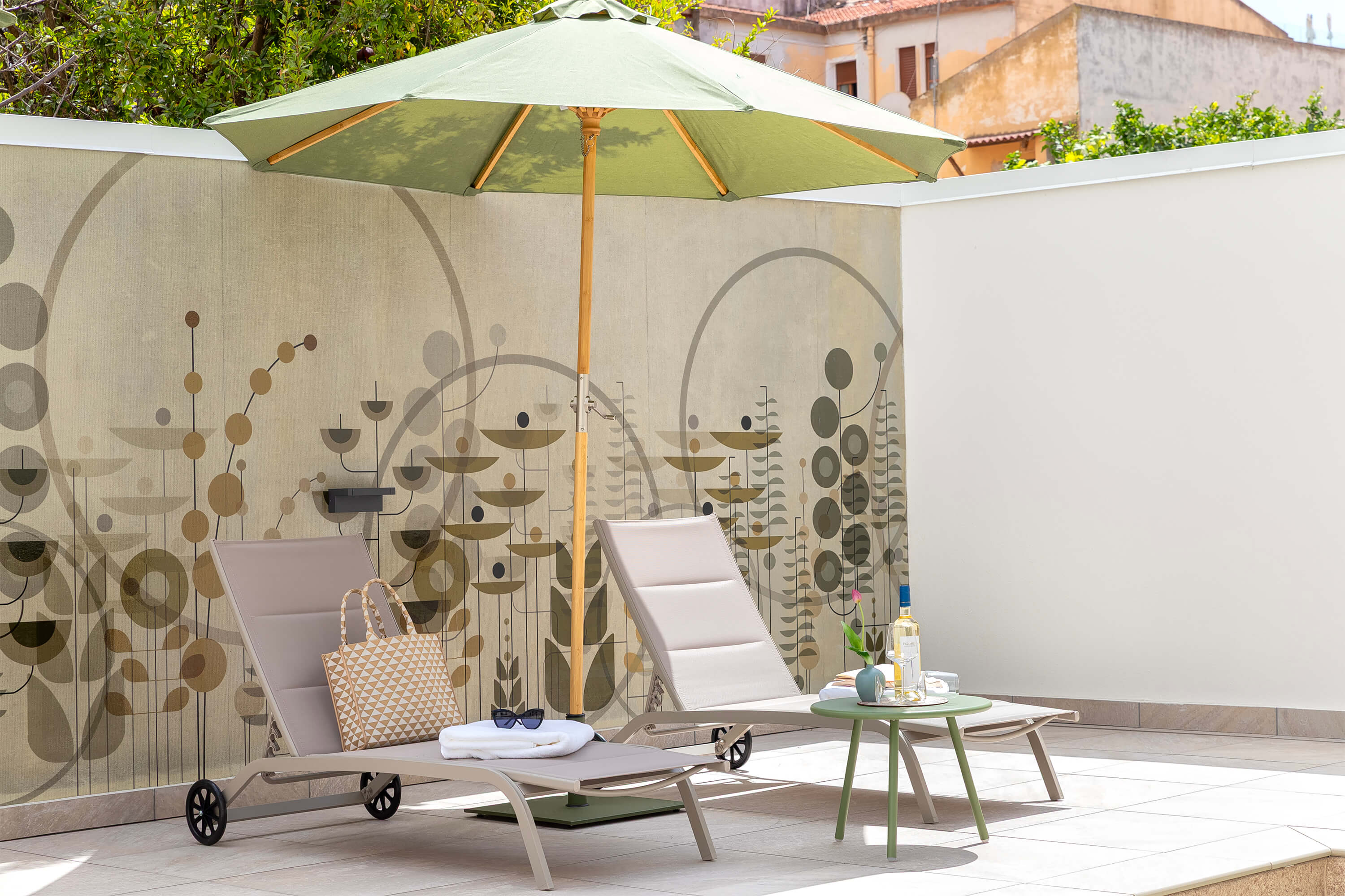 Attrezzata con eleganti chaise-longue e ombrelloni, la piscina offre uno spazio intimo e curato nei dettagli, perfetto sia per un tuffo rinfrescante che per rilassarsi al sole con un buon libro o un bicchiere di vino.