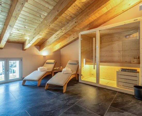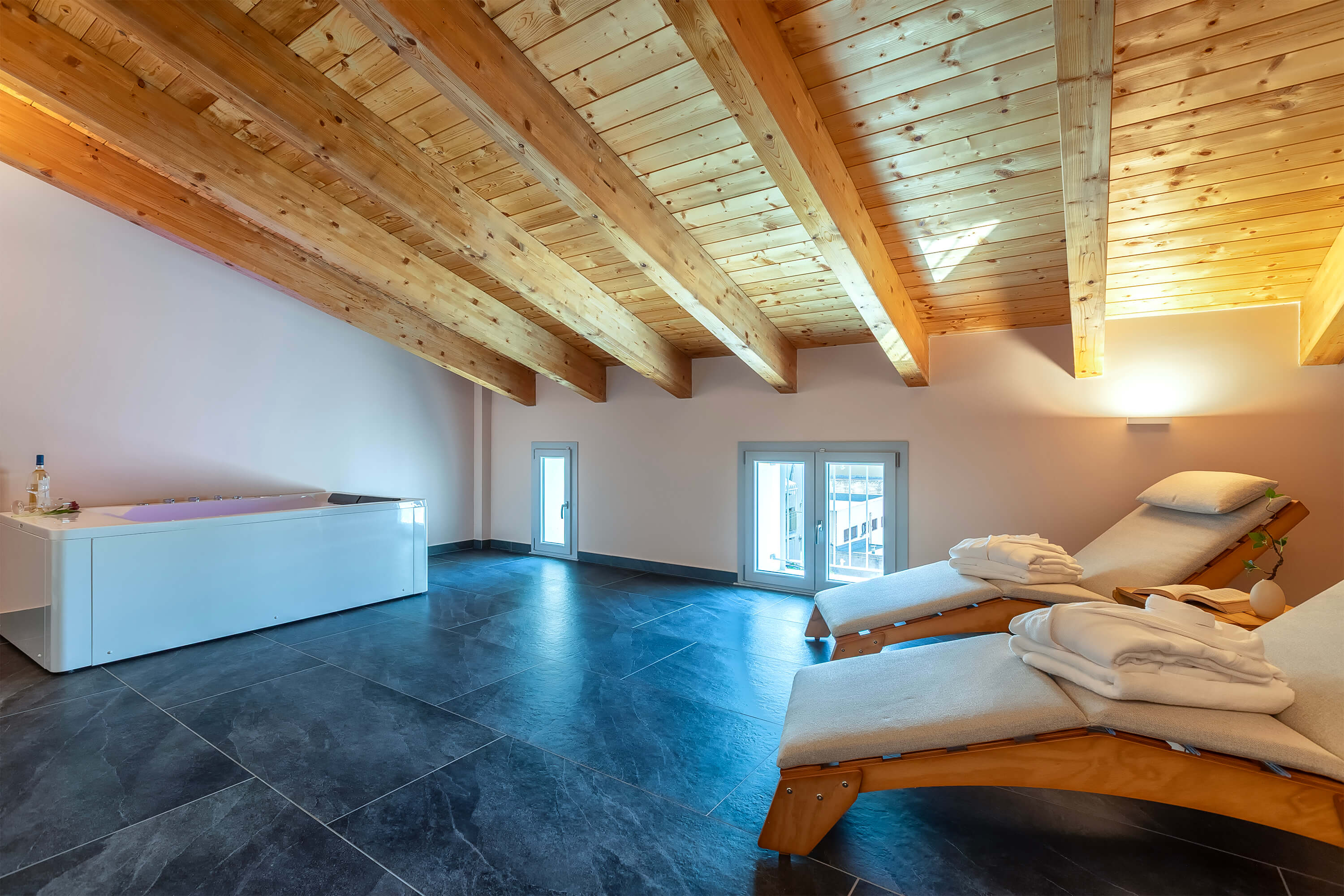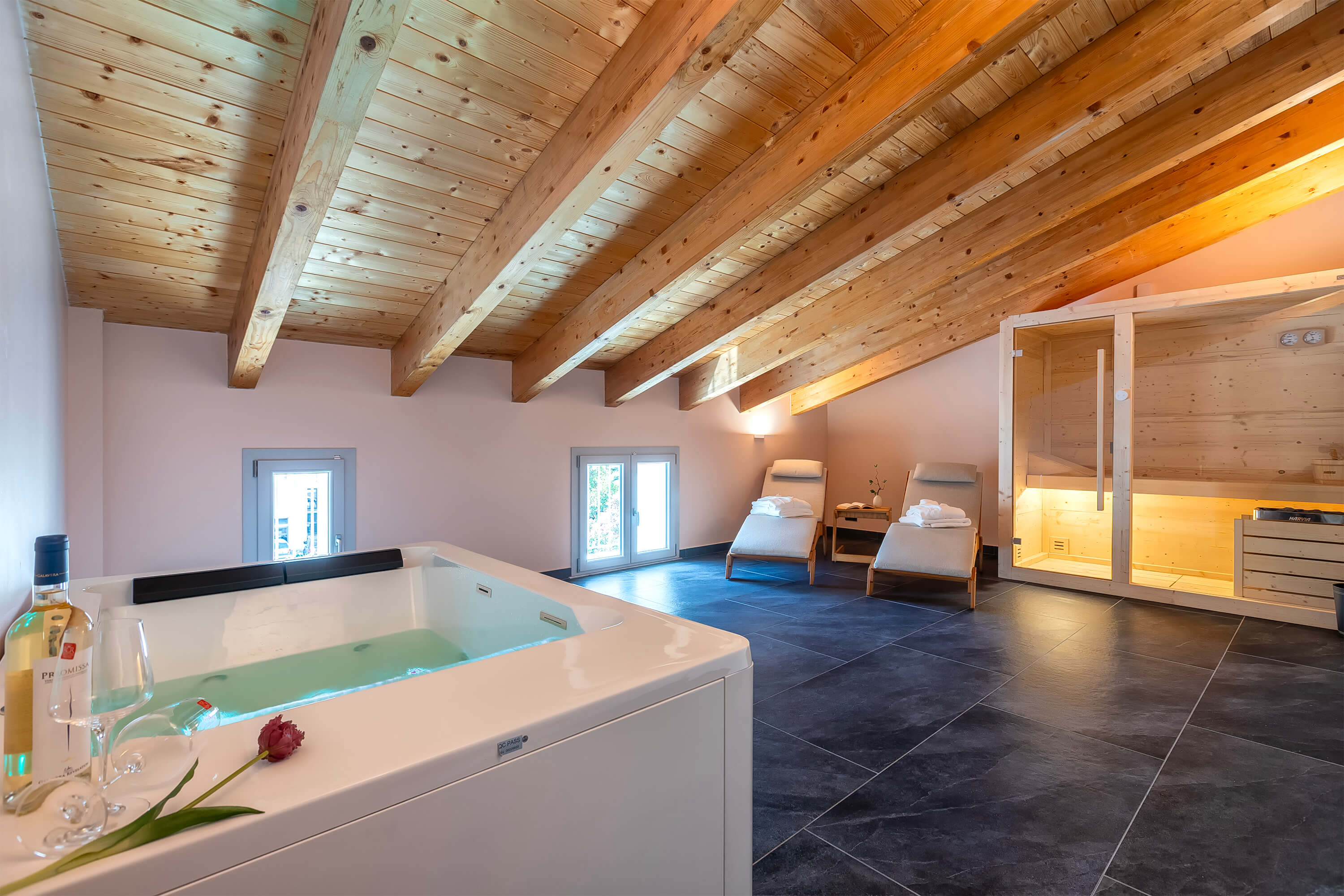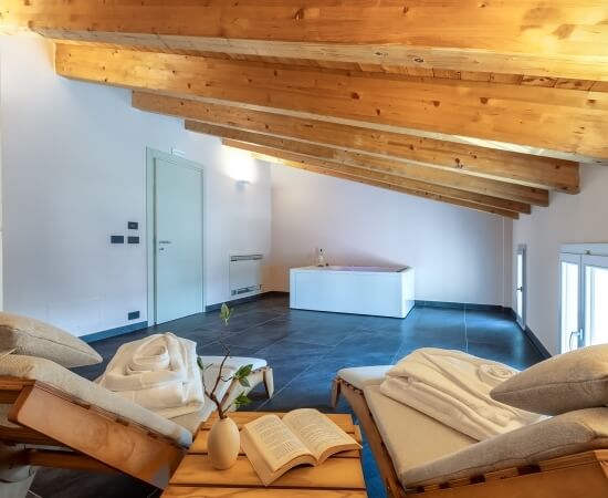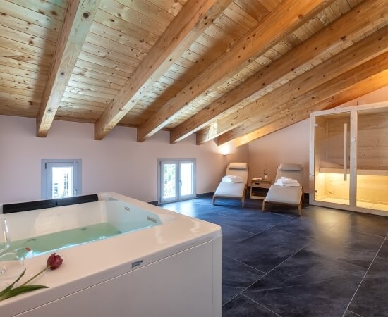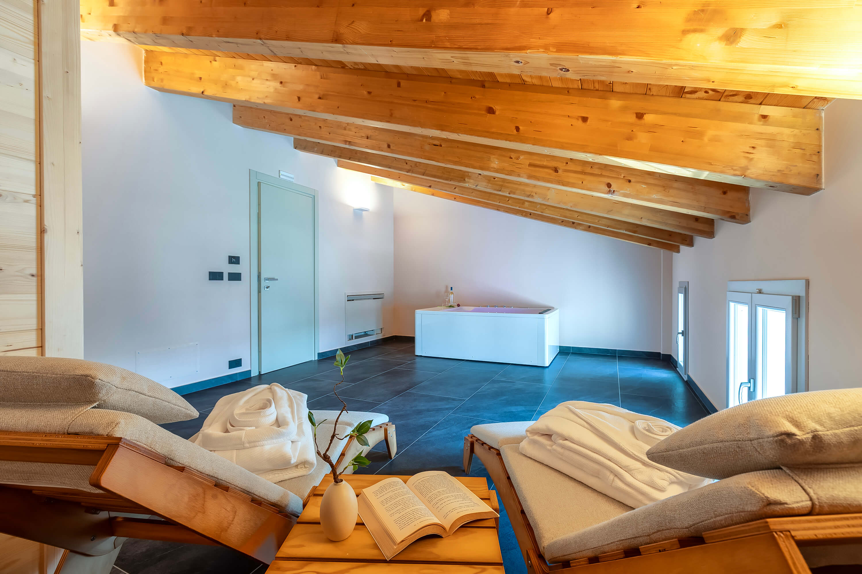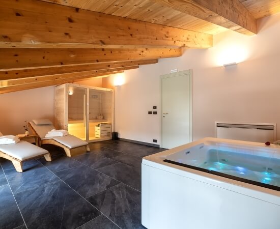 Un ambiente intimo ed esclusivo, pensato per garantire relax e tranquillità: qui potrete immergervi nella vasca idromassaggio, rilassarvi nella sauna per due persone e proseguire il vostro momento di serenità sulle comode chaise longue.
